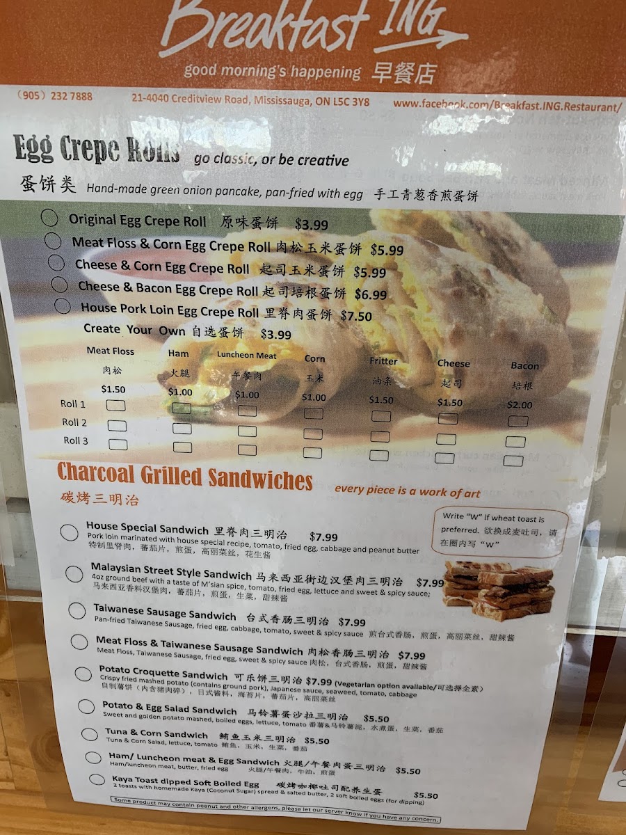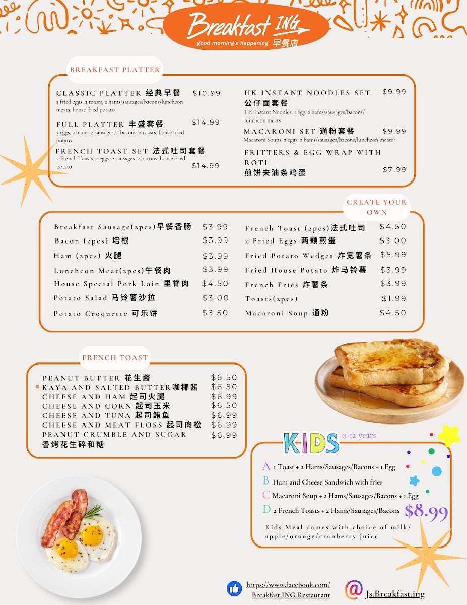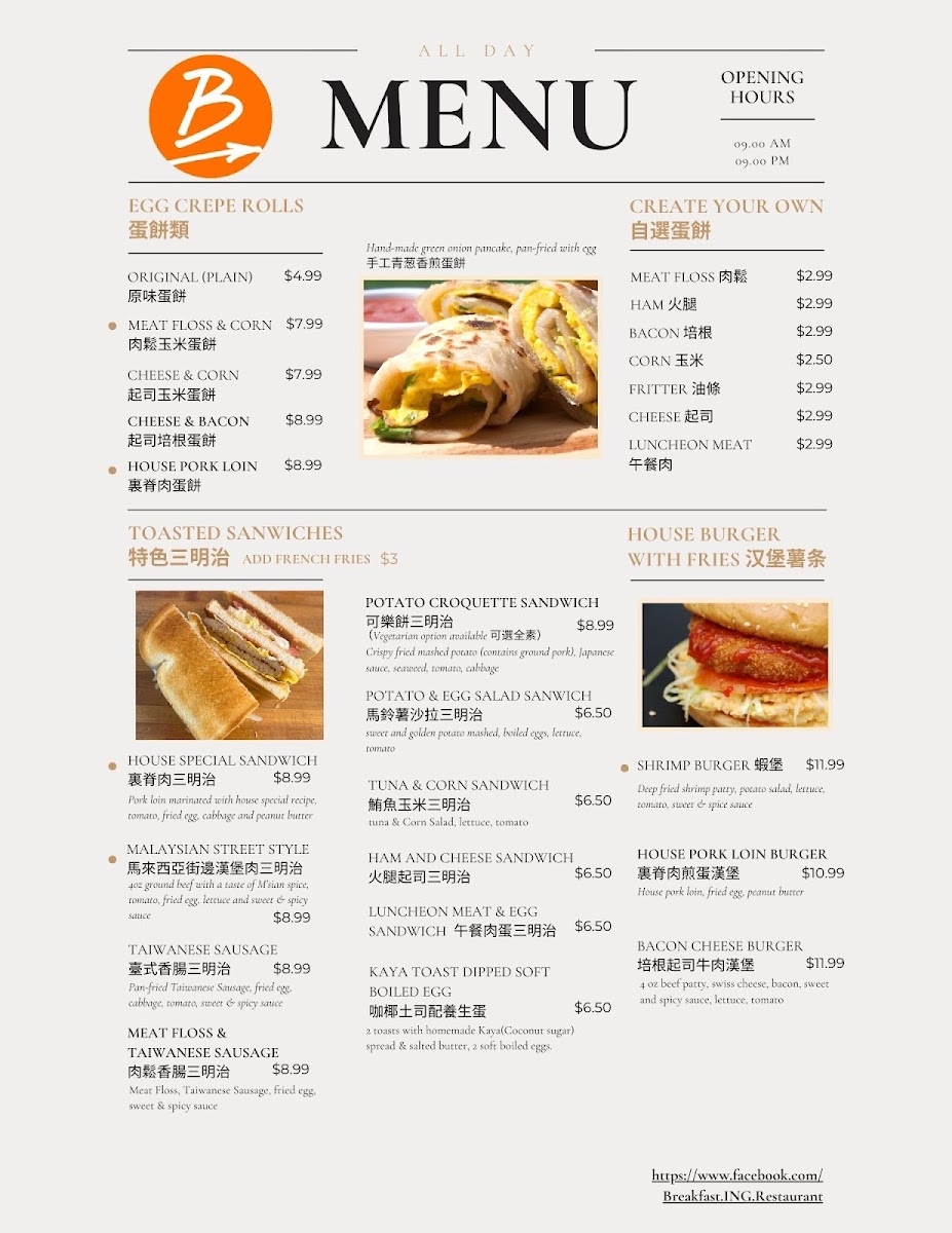 As a final impression, the menu at Breakfast Ing Restaurant offers a well-curated and satisfying snapshot of Malaysian-inspired comfort food blended with classic breakfast staples, making it a versatile choice for many tastes. The Egg Crepe Rolls section stands out for its variety, from the customizable Create Your Own Egg Crepe Rolls to flavorful options like Meat Floss And Corn Egg Crepe Roll, Cheese And Bacon Egg Crepe Roll, House Pork Loin Egg Crepe Roll, and the simple yet comforting Original Egg Crepe Roll, all of which highlight a balance between softness, richness, and savory fillings. The Toasted Sandwiches with Fries further expand the menu with heartier choices such as Malaysian Street Style Sandwich, House Special Sandwich, Shrimp Burger, Potato And Egg Salad Sandwich, and Ham And Cheese Sandwich, offering both familiar and street-food-inspired flavors. For lighter bites or add-ons, the Side Order Choices like Potato Croquette, Roti Canai, Potato And Egg Salad, Spiced Fried Potato, and Vegetarian Potato Croquette provide flexible pairing options. Those looking for something more substantial will appreciate the Noodles Soups And Rice Dishes, including Claypot Bakkutteh With Rice, Malaysian Curry Laksa, Malaysian Curry Chicken With Rice, Bakkutteh Noodles, and Roti Canai With Malaysian Curry Chicken, which bring depth and warmth through traditional Malaysian seasonings. Drinks such as 100 Plus Drink, Soy Milk With Pandan Jelly, Signature Milk Tea, Coffee With Milk Tea, and Soy Milk complement the food well, while the French Toast Collection-featuring Kaya And Salted Butter French Toast, Cheese And Tuna French Toast, Peanut Crumble And Sugar French Toast, Cheese And Ham French Toast, and Cheese And Corn French Toast-adds a sweet-savory brunch appeal. Finally, the Signatured Breakfast Platter options like Classic Platter, French Toast Set, Hk Instant Noodles Set, Full Platter, and Create Your Own Breakfast Platter, along with Malaysian Favourite Snacks such as Himalayan Salt Candy and Himalayan Salt Candy 1 Box 12 Packs, round out a menu that feels complete, comforting, and thoughtfully designed, leaving a strong and memorable overall impression.