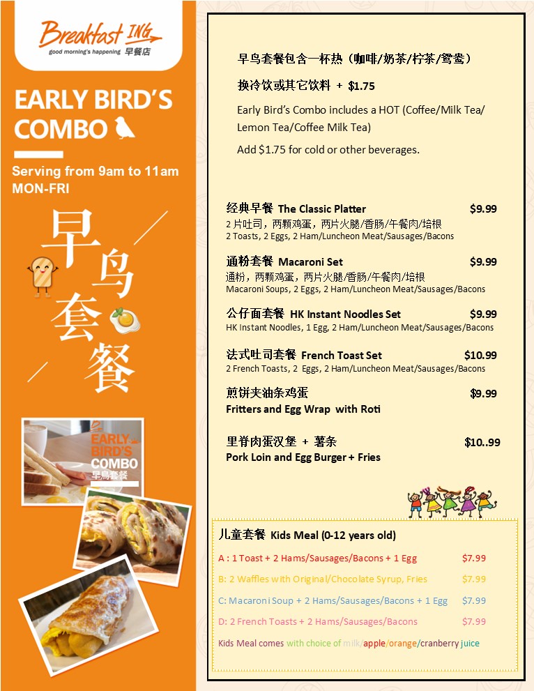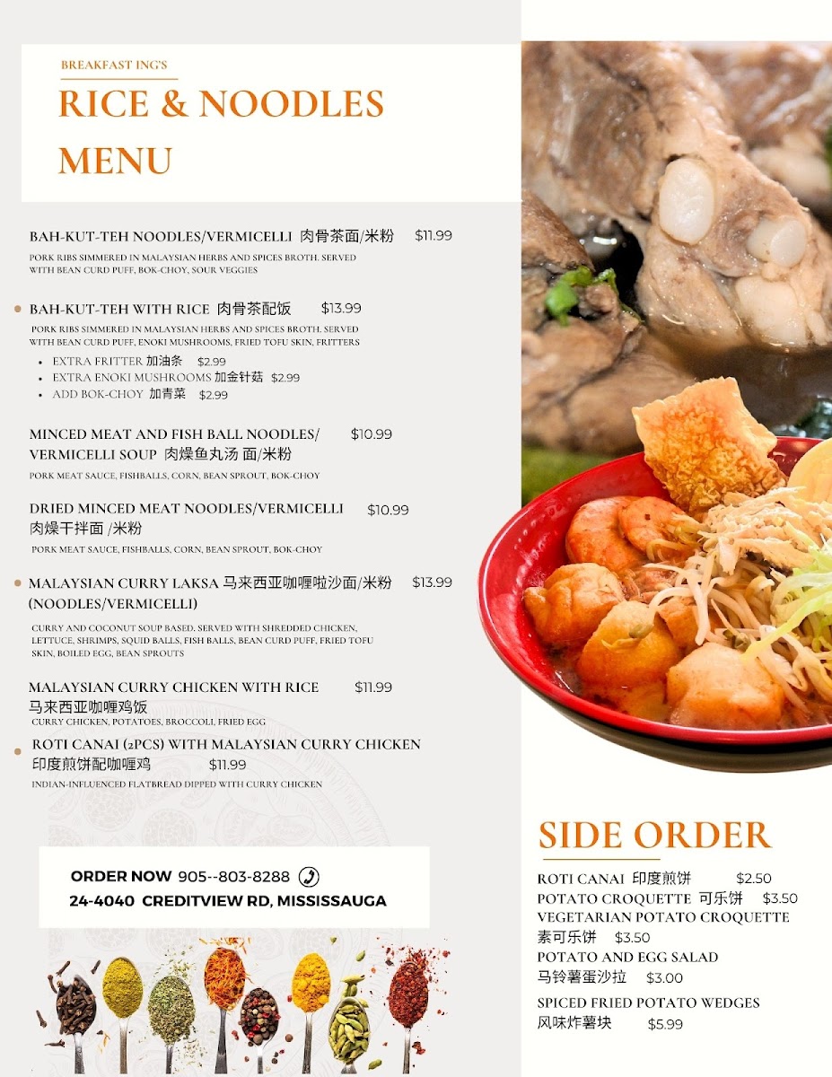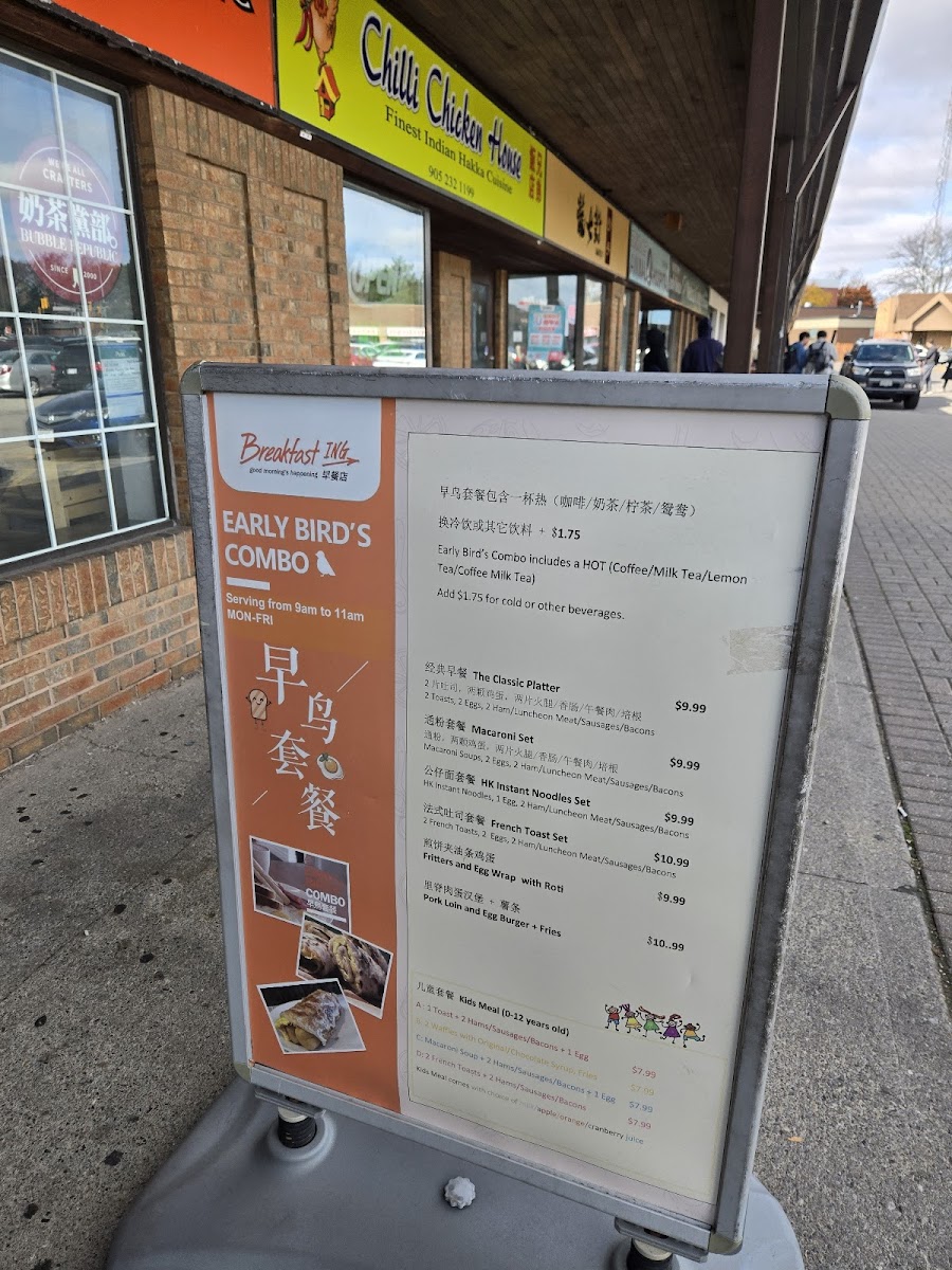 As a final impression, the menu at Breakfast Ing Restaurant offers a well-curated and satisfying snapshot of Malaysian-inspired comfort food blended with classic breakfast staples, making it a versatile choice for many tastes. The Egg Crepe Rolls section stands out for its variety, from the customizable Create Your Own Egg Crepe Rolls to flavorful options like Meat Floss And Corn Egg Crepe Roll, Cheese And Bacon Egg Crepe Roll, House Pork Loin Egg Crepe Roll, and the simple yet comforting Original Egg Crepe Roll, all of which highlight a balance between softness, richness, and savory fillings. The Toasted Sandwiches with Fries further expand the menu with heartier choices such as Malaysian Street Style Sandwich, House Special Sandwich, Shrimp Burger, Potato And Egg Salad Sandwich, and Ham And Cheese Sandwich, offering both familiar and street-food-inspired flavors. For lighter bites or add-ons, the Side Order Choices like Potato Croquette, Roti Canai, Potato And Egg Salad, Spiced Fried Potato, and Vegetarian Potato Croquette provide flexible pairing options. Those looking for something more substantial will appreciate the Noodles Soups And Rice Dishes, including Claypot Bakkutteh With Rice, Malaysian Curry Laksa, Malaysian Curry Chicken With Rice, Bakkutteh Noodles, and Roti Canai With Malaysian Curry Chicken, which bring depth and warmth through traditional Malaysian seasonings. Drinks such as 100 Plus Drink, Soy Milk With Pandan Jelly, Signature Milk Tea, Coffee With Milk Tea, and Soy Milk complement the food well, while the French Toast Collection-featuring Kaya And Salted Butter French Toast, Cheese And Tuna French Toast, Peanut Crumble And Sugar French Toast, Cheese And Ham French Toast, and Cheese And Corn French Toast-adds a sweet-savory brunch appeal. Finally, the Signatured Breakfast Platter options like Classic Platter, French Toast Set, Hk Instant Noodles Set, Full Platter, and Create Your Own Breakfast Platter, along with Malaysian Favourite Snacks such as Himalayan Salt Candy and Himalayan Salt Candy 1 Box 12 Packs, round out a menu that feels complete, comforting, and thoughtfully designed, leaving a strong and memorable overall impression.